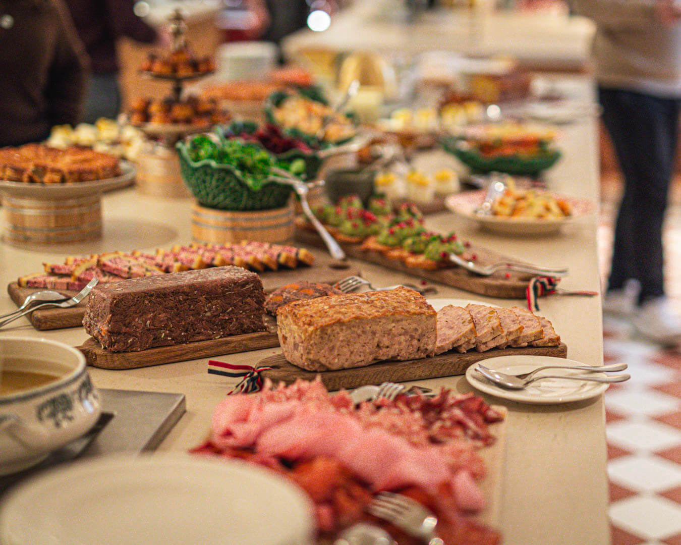 C’est un tableau tout à fait impressionnant que de débarquer dans cette magnifique cuisine et d’admirer la profusion des plats préparés par les équipes. C’est somptueux ! Tout est prévu pour chacun se régale : de la charcuterie, des œufs brouillés, un pâté en croûte, des pâtés, des salades en tout genre, des tartes, des légumes rôtis, des œufs mimosa digne d’une œuvre d’art, du fromage à la coupe, du poisson et même quelques fruits de mer. Les équipes en place proposent également de servir une entrée ou deux plats chauds. Puis vient enfin la valse des desserts, avec le très célèbre (et réconfortant) riz au lait de la maison, compote, entremet, gâteau et chocolat et j’en passe. Autant vous dire qu’il ne reste plus un seul centimètre carré non utilisé sur cette table et tout donne particulièrement envie !